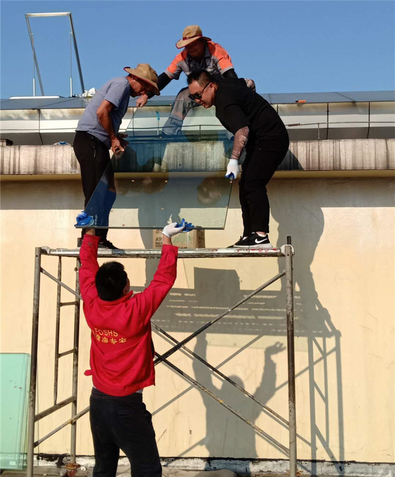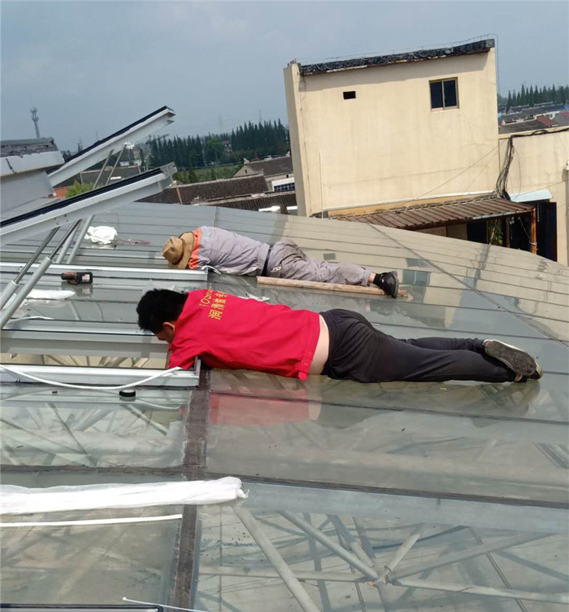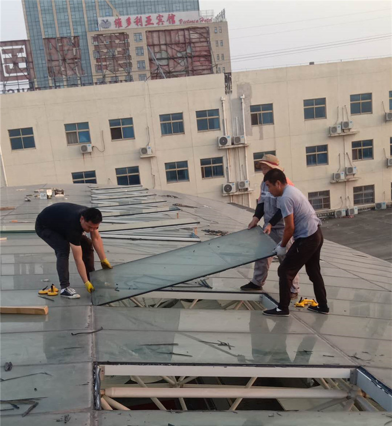 根據施工圖紙,需先將部分采光玻璃拆除,光滑的玻璃屋面給現場施工增加了難度。現場環境不允許大型作業車入場作業,鑫友售后安裝部員工硬是憑自身力氣將一塊塊玻璃拆除,更換上鑫友電動排煙窗。