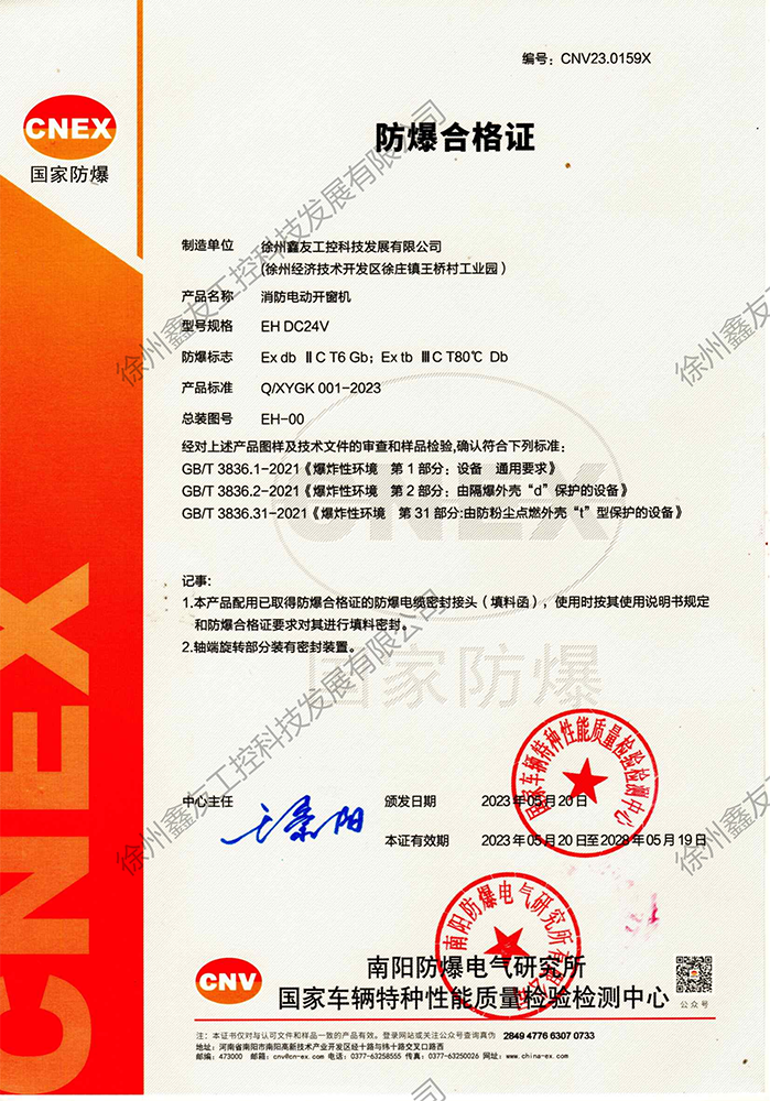 電動螺桿開窗機防爆合格證書(粉塵環(huán)境下)