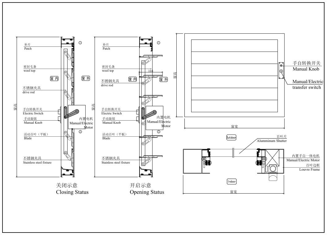 Manual &Electric integrated louvre are controlled by both manual rotary knob and electric actuators. They are widely used in ventilation, sunshade &security ,etc. You can open and close the louvre by manual instead of electric window actuator when it is power shortage in emergency.